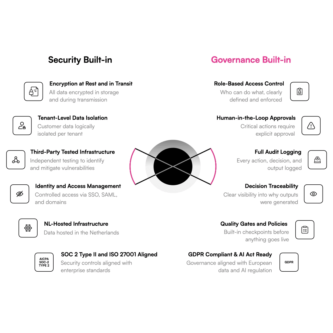 Third-party tested and NL-hosted infrastructure. GDPR-compliant, AI-Act-ready, and ISO 27001 certified. All data encrypted in storage and during transmission.