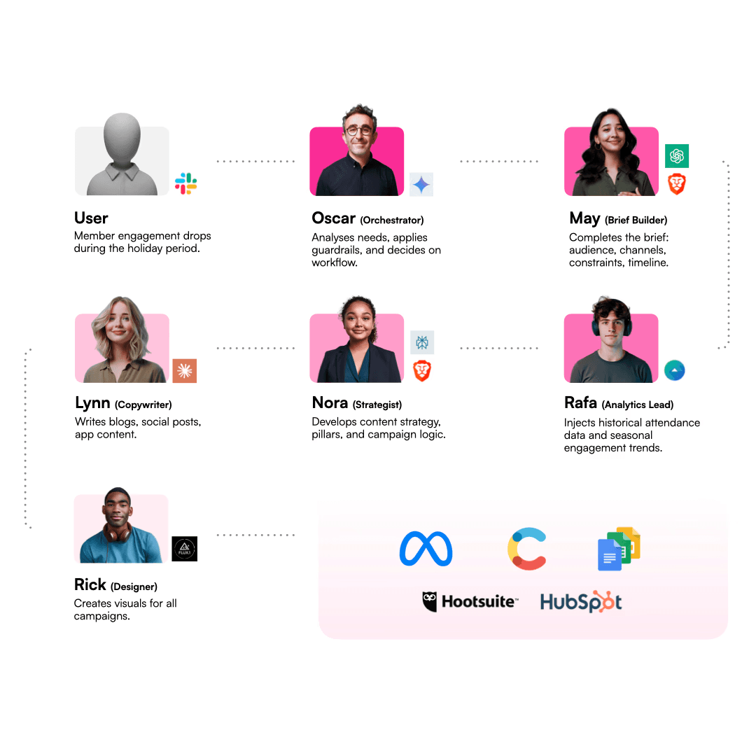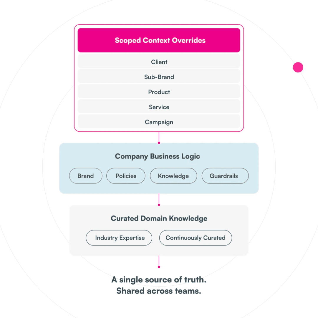 All agents operate from a shared brand memory, context and knowledge base. Updates are applied once and immediately available everywhere.